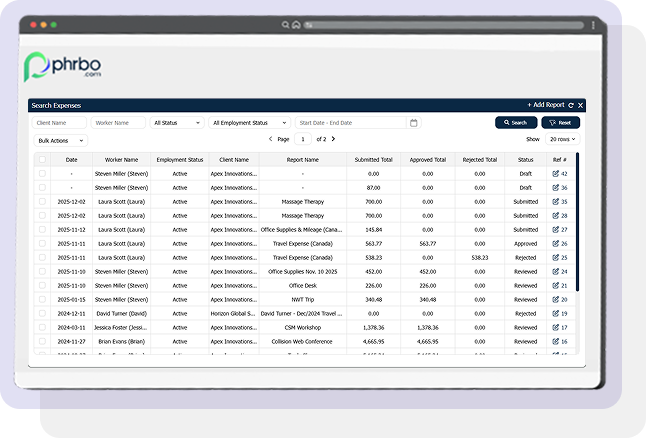 Operations teams gain a real-time view of every submitted expense across clients and workers. Track status, review receipts, and prevent approval delays before payroll or invoicing cycles close.